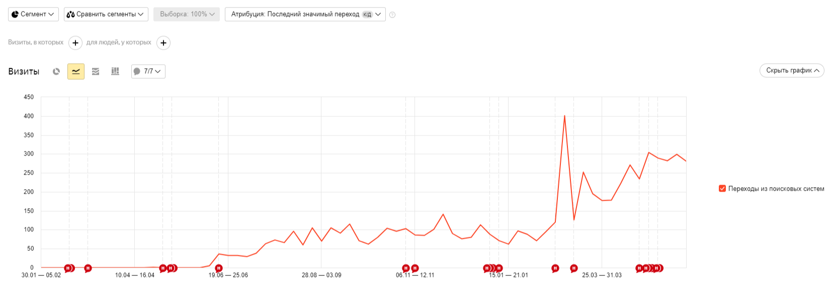 Сайт активно поддерживается и продвигается и сейчас. Постоянно ведутся работы по улучшению, оптимизации как новых страниц и разделов сайта, так и старых. Увеличивается ссылочная масса. Исправляются ошибки и многое другое. Активно ведутся рекламные кампании в Яндекс Директ. Весь этот спектр работ по